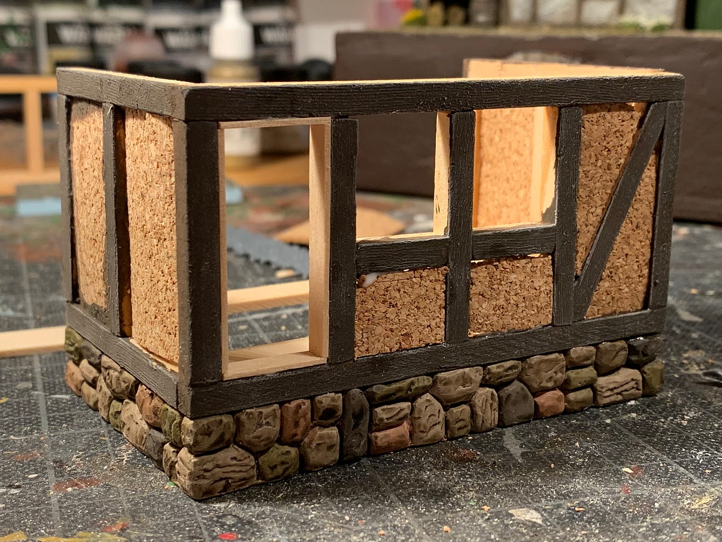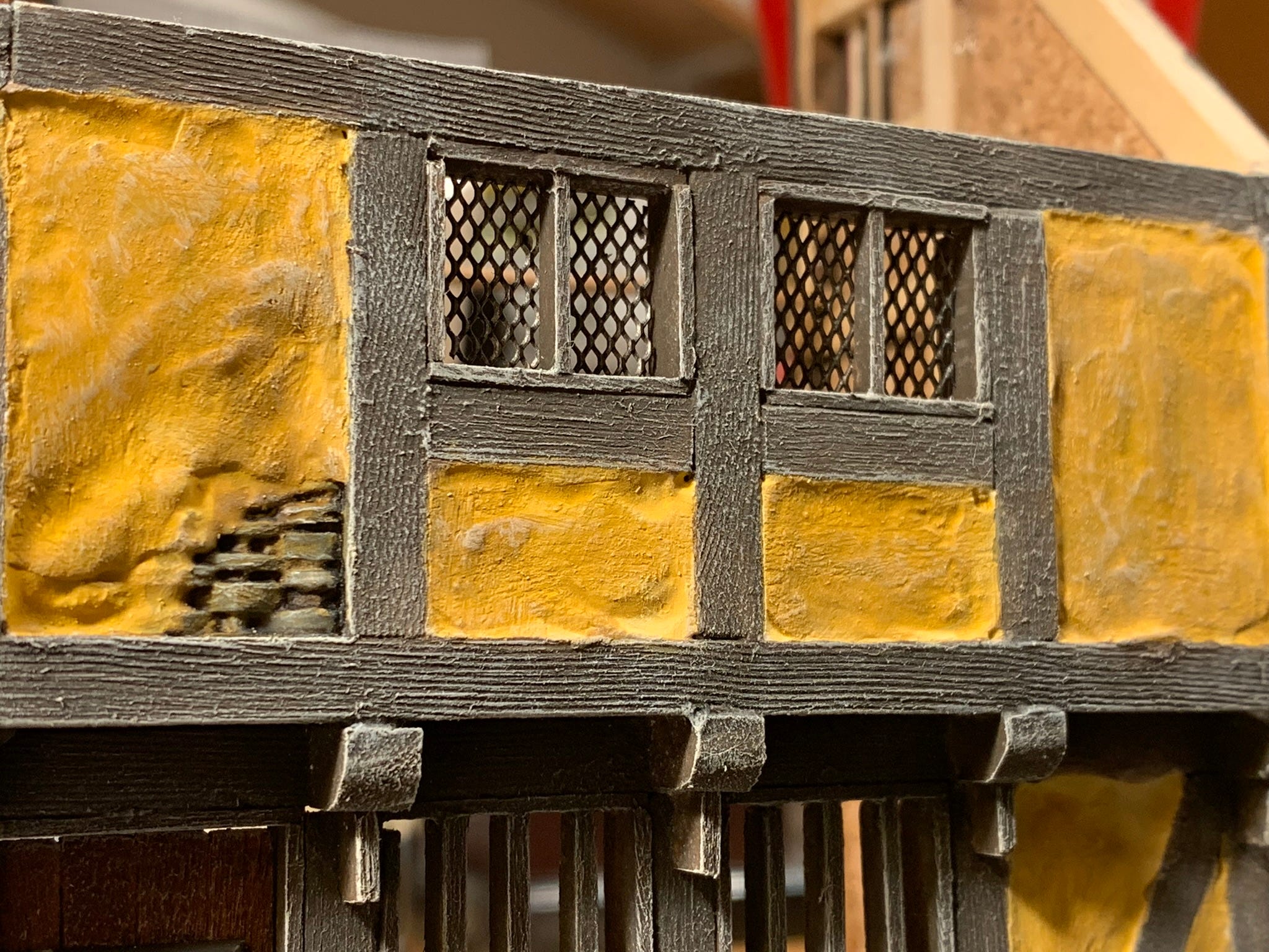 Eventually the house began to take shape and I started wondering about how to fill the areas between the timbers.
