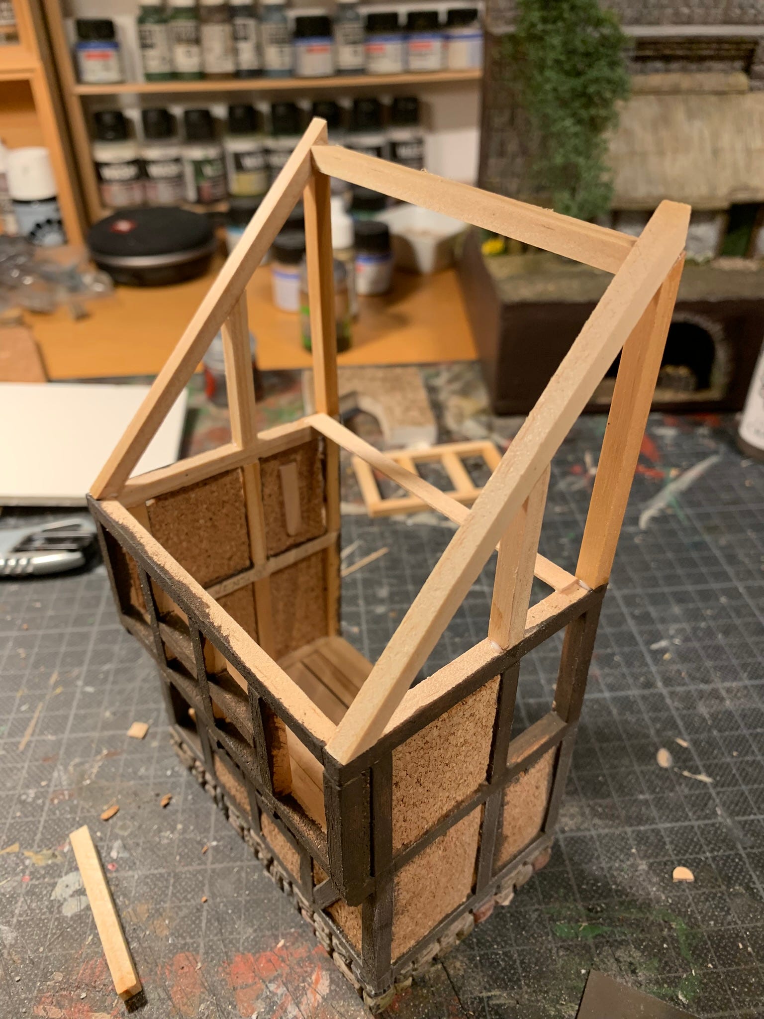 I added plaster on top of the cork in order to fill the spaces between the timbers – se more in the video below.